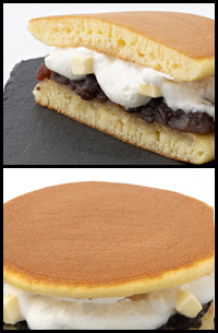 ふわふわ、もちもちとした皮に粒あん、ホイップクリーム、角切りのバターを仕込んだ、洋風どら焼きです。