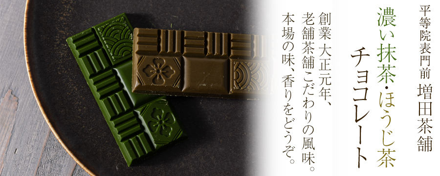 宇治茶の本場・京都宇治。宇治観光でも人気の「平等院表参道」にお店を構える、老舗の宇治茶専門店「増田茶舗」の「濃い抹茶・ほうじ茶チョコレート」のセットです。