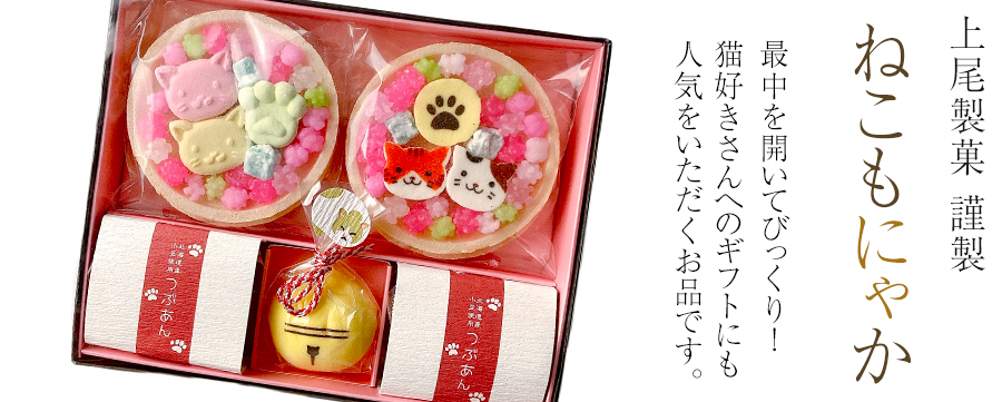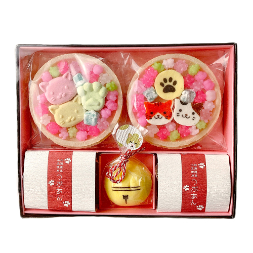 | 内容量(入り数) | 1箱 (ねこもにゃか14g×2、粒餡35g×2、鈴鳳瑞1個) |