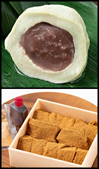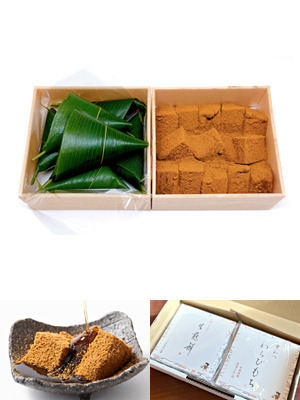 | 内容量(入り数) | ・京生麸餅(熊笹巻き)6個入 ・黒みつわらび餅350g (黒みつ、きな粉別添え) 各1箱 |