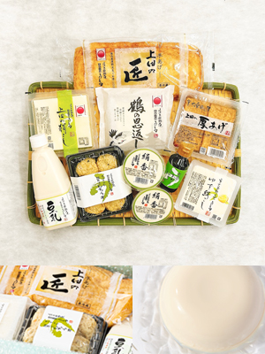 | 内容量(重さ) | 絹香(110g)×2、上田の匠 手あげ(1枚)、厚あげ(4個入)、ちっちゃなひろうす(6個入)、豆乳(500ml)、上田の絹こし(400g)、ゆず絹こし(230g)、鶴の恩返し(230g)、豆腐のおだし(115g) |