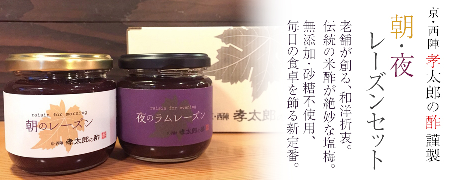 創業以来変わらぬ手づくりの製法で造り続けられたお酢は、時間が作り出す味の深み、まろやかさがあります。 そんな豊かな風味のお酢で注目の食材、レーズンを漬け込んだ新しい味わいが誕生致しました。 レーズンはマラソンランナーの方にも注目される食材で、エネルギーに変わるのが早く鉄分も豊富なので、別名【クイックエネルギー】とも呼ばれます。 無添加のお酢と、有機レーズン。毎日食べたくなる、体にも嬉しい逸品です。 【朝のレーズン】 こだわりの100%ブドウ果汁と和歌山県産南高梅から造った梅酢、孝太郎の米酢で砂糖を一切使用せず漬け込みました。 有機レーズンの自然な甘味を楽しんで頂けるよう、甘酸っぱい味に仕上げました。 毎朝のヨーグルトのトッピングとしてや、焼いたトーストなども美味しく召上って戴けます。 アルコールは使用していませんのでお子様や車でのご出勤前でも安心して毎朝召上って頂けます。 【夜のラムレーズン】 朝のレーズンに更にこだわりの無添加・無着色の沖縄県産ラム酒で味付けし、大人の味に仕上げました。 サトウキビから無添加で造られたラム酒には力強い香りと味わいがあり、とても芳醇な味わい。 こちらも砂糖は使用せず自然の甘みを味わっていただけます。 レーズンサンドやお酒のおつまみなど大人の味でお楽しみ下さいませ。 注意:アルコールが3%含まれていますので、お酒が気になる方やお子様などはご注意下さいませ。 |